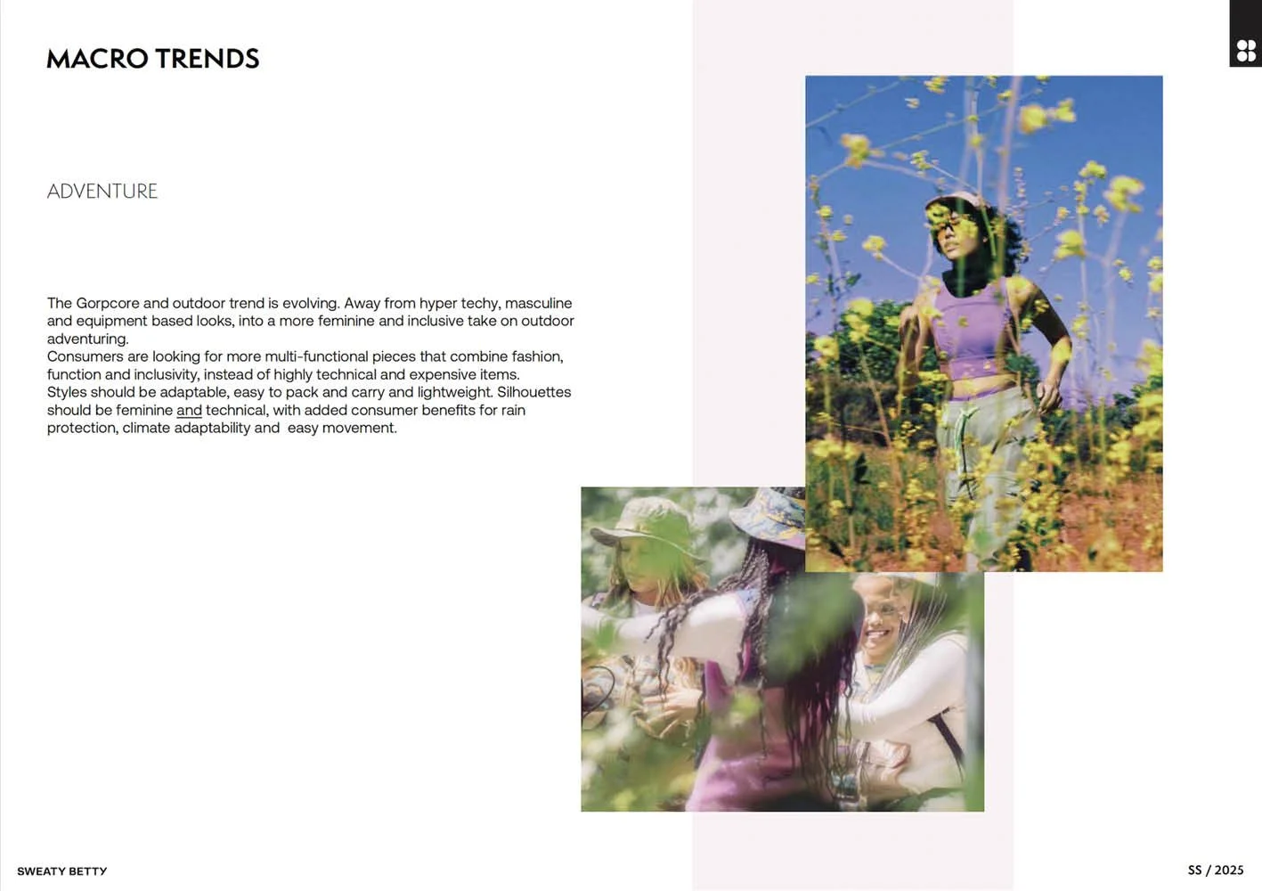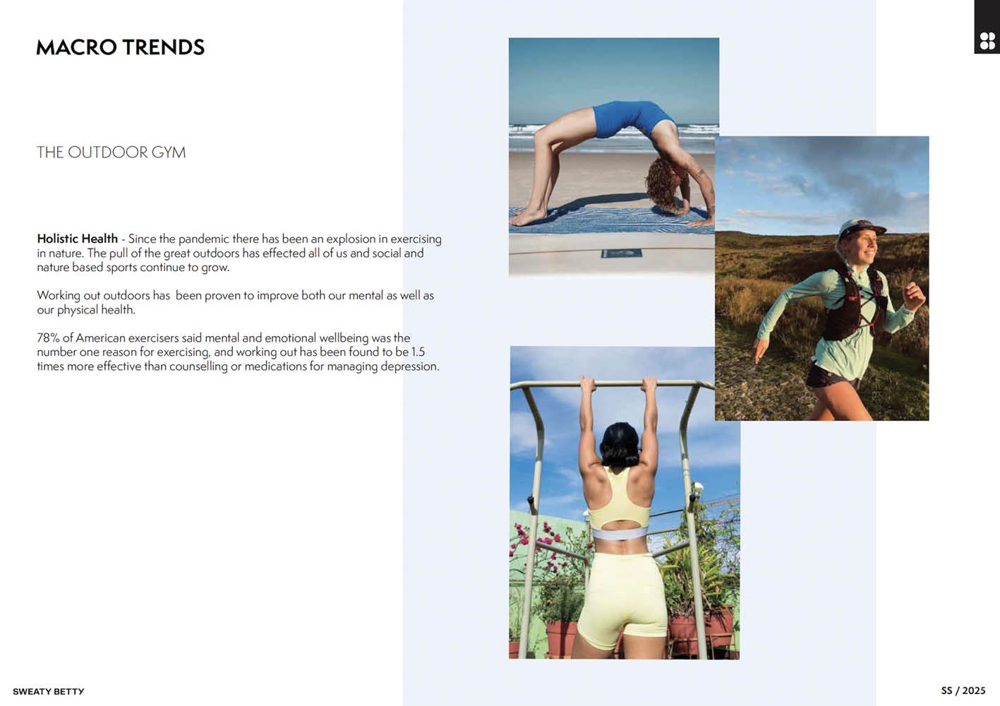 Sweaty Betty was highly retail led taking its creative direction from the sales performance of classic items with their existing consumer base and repeating the formula each season. Our remit was to empower the design and product teams to create new, innovative and bolder product, and to bring a point of view to both the retail and wholesale product ranges through product and the brand’s purpose driven message.